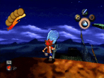 IJ up from the first monkey onto the wall, here you want to walk towards the second monkey. As you are above him, jump and swing the net backwards to turn around. Hit L1 to center the camera.